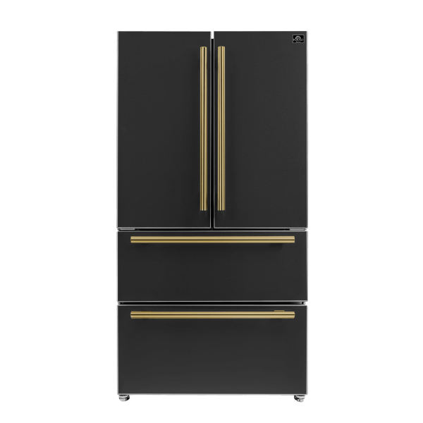 The Forno 36" Espresso Moena French Door Stainless Steel Refrigerator offers a 19.2 cu.ft capacity, featuring an LED display and built-in ice maker. This frost-free refrigerator is equipped with swing double doors and an inverter compressor for efficient cooling.Brand