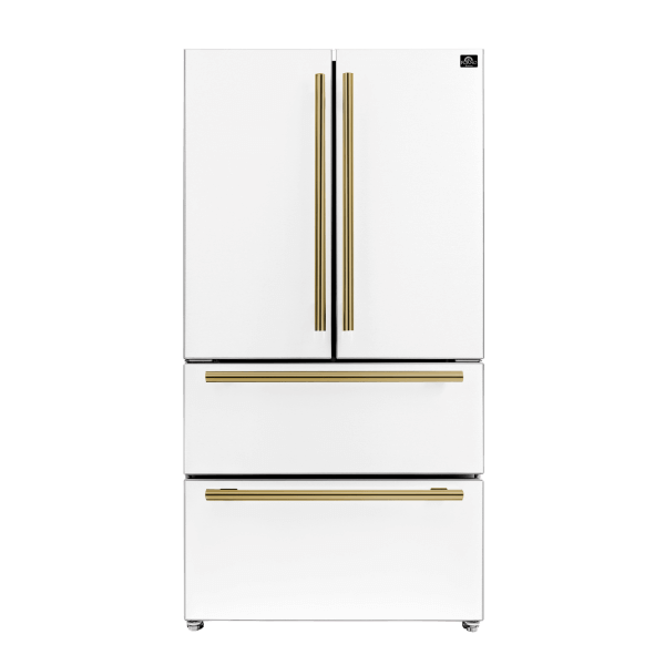 The Forno Espresso Moena 36-inch French Door Refrigerator offers a 19.2 cu.ft. capacity, combining style and functionality with its frost-free multi-air flow cooling system. The fresh food compartment (12.1 cu.ft.) includes three glass shelves (two adjustable), six door bins, and two crisper drawers. The 7.1 cu.ft. freezer features two full-width pull-out storage drawers and a high-capacity automatic ice maker producing up to 4 pounds of ice daily. An LED touch panel allows precise temperature control, while high-efficiency LED lighting ensures uniform illumination. The compressor inverter ensures energy efficiency, quiet operation, and precise temperature control. The refrigerator comes with two sets of handles—stainless steel and antique brass—for customization. It is ENERGY STAR certified, promoting energy efficiency.Brand