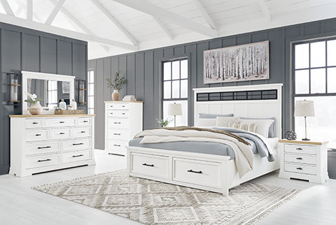 The Ashbryn 7-Piece Queen Panel Storage Bed Set by Ashley Furniture combines modern farmhouse design with practical features. Crafted from hardwood solids, MDF substrates, and butcher block oak veneer, it showcases a two-tone finish with natural oak tops and white cases. The set includes a queen panel storage bed with unique barn sash accents, dresser, mirror, and two nightstands, offering ample storage and a stylish aesthetic for your bedroom.Brand