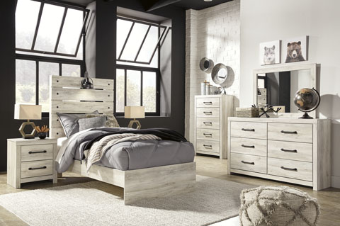 The Cambeck Twin Panel Bed by Signature Design from Ashley combines rustic charm with modern functionality. Featuring a wispy white finish over replicated oak grain, it offers a weathered look that suits both modern loft and farmhouse interiors. The headboard includes a decorative matte black sconce light, ideal for nighttime reading, and dual USB charging ports for added convenience. Constructed from engineered wood with decorative laminate, this bed blends style and practicality seamlessly.Brand