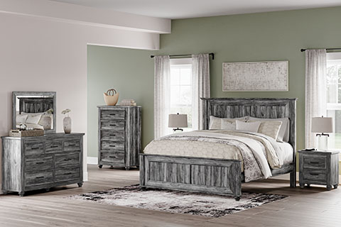 The Thyven King Panel Bed by Ashley Furniture features a smoky gray finish over replicated oak grain, creating a driftwood look that brings an ethereal vibe to your bedroom. This large-scaled bed showcases traditional details in a warm, weathered hue, including case pilasters, framed drawer fronts, and bun feet.Brand