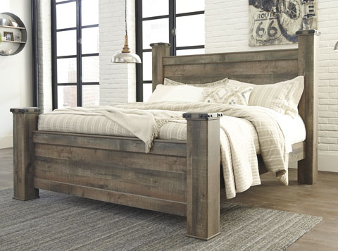 The Trinell 7-Piece King Panel Bedroom Set by Signature Design by Ashley showcases a warm rustic plank finish over replicated oak grain, delivering an authentic touch. The set includes a king panel bed (headboard, footboard, and rails), dresser with LED fireplace option, mirror, and chest. Design elements feature nailhead trim on case tops and bed panels, side roller glides for smooth drawer operation, and dark bronze metal-finished handles with nailhead accents. The nightstand offers a slim-profile dual USB charger on the back. The dresser accommodates the W100-01 or -02 fireplace insert and is compatible with W100-41 integrated audio.Brand