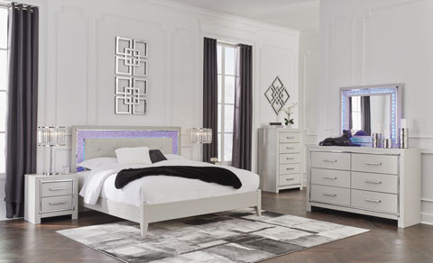 The Ashley Zyniden 7-Piece King Upholstered Panel Bed Set features a luxurious design with an all-over silver pearl faux gator finish. Both the bed and accompanying case pieces are accented with faceted chrome details, while dazzling faux crystal-accented handles enhance the set's elegance. The headboard is upholstered in silver faux gator material, adorned with faux crystal tufting and glitter inlays, and includes LED lighting with a remote control for customizable color and brightness settings. For added convenience, the nightstand offers both USB and wireless charging options. The set includes a king upholstered panel headboard, footboard with rails, dresser, mirror, chest, and two nightstands.Brand