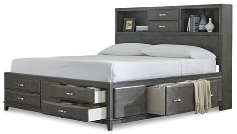 The Caitbrook Gray King Storage Bed by Ashley Furniture offers a blend of contemporary design and practical storage solutions. Crafted from wood, veneers, and engineered wood, it features a distinctive weathered gray finish that adds a touch of casual elegance to any bedroom. The bed includes a storage headboard, footboard, and side rails, providing ample space with eight smooth-operating drawers for storing bedding, clothing, or other essentials. The contoured drawer fronts and linear metal drawer pulls in a bright nickel-tone finish enhance its modern appeal. Notably, this bed does not require a foundation or box spring, simplifying setup and maintaining a sleek profile.Brand