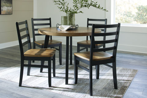 The Blondon Dining Table and 4 Chairs (Set of 5) by Signature Design by Ashley transforms your dining area into a rustic retreat. The two-tone finish adds charm, while the tabletop's inlay chevron pattern provides a unique touch. Ladderback chairs complement the overall design.Brand