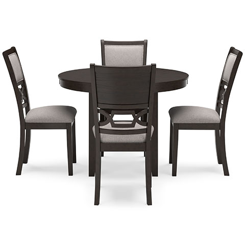 The Langwest Dining Table and 4 Chairs (Set of 5) by Signature Design by Ashley features a clean-lined profile and a traditional cherry finish. The table is constructed from rubberwood solids, mindi veneer, and MDF substrates, ensuring durability. The accompanying chairs are made with wood and engineered wood, providing a cohesive and stylish dining set.Brand