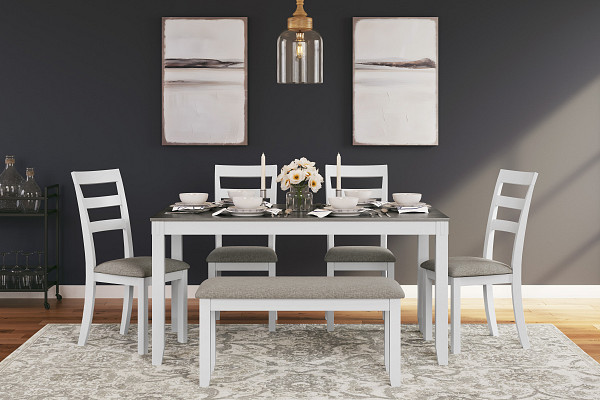 The Stonehollow Dining Table and 4 Chairs and Bench Set creates a cohesive, modern farmhouse feel with its clean-lined profile and chic two-tone color scheme. Its upholstered ladderback chairs are such a classic, while the addition of a comfortably cushioned bench brings a modern sensibility to the table.Brand