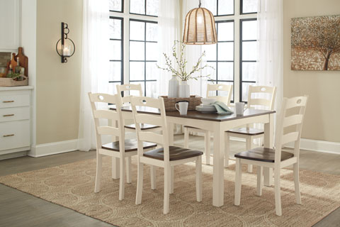The Woodanville 7-Piece Dining Room Set transforms your eat-in kitchen or dining area into a cottage-chic haven. This set features a two-tone finish that adds a double dose of charm, complemented by gracefully arched aprons. Included are six pierced ladderback dining chairs that perfectly enhance the ensemble's classic appeal.Brand