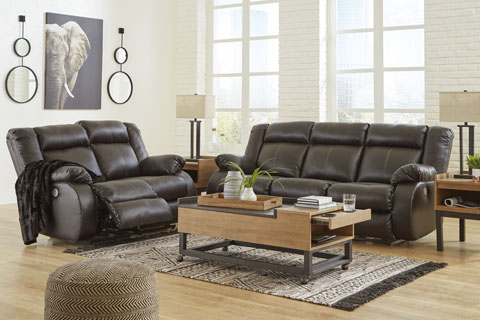 Elevate your living room with the Denoron Power Reclining Leather Living Room Set from Ashley Furniture. This stunning set in Chocolate exudes contemporary elegance while offering unparalleled comfort. Crafted from durable faux leather, it seamlessly blends style with functionality. The dual-sided recliner and stationary middle seat cater to your seating preferences. Easily adjust your reclining position with the one-touch power control feature. The zero-draw USB plug ensures energy efficiency, saving power when not in use. Upholstered in vinyl/polyester/polyurethane, this set features a corner-blocked frame and metal-reinforced seat for added durability. Sink into luxury with the exaggerated headrest and high-resiliency foam cushions enveloped in thick poly fiber. Experience gentle rocking with the UL-listed power cord. Redefine relaxation with this Denoron Power Reclining Sofa.Brand