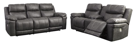 The Erlangen Living Room Set by Ashley Furniture includes a power reclining sofa and a power reclining loveseat with console, both featuring adjustable headrests. Upholstered in midnight-colored faux leather, the set offers contemporary style and enhanced comfort.Brand