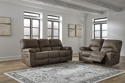 Living room lounging, with a touch of simply stunning character. This seating package seamlessly complements your contemporary cozy space. Accented by jumbo stitching, the versatile chocolate faux leather is a tried-and-true approach to everyday style. And with only a simple pull needed to extend on either side, this set proves homey, inviting design and superb comfort go hand in hand. Kilmartin - Chocolate - Reclining SofaBrand