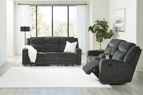 The Martinglenn 3-Piece Reclining Living Room Set offers a harmonious blend of form and function, designed for everyday comfort. Its modern motion features and velvety soft upholstery in a versatile dark neutral hue provide a contemporary yet relaxed aesthetic. The set includes a reclining sofa with a drop-down table, a double reclining loveseat with a console, and a rocker recliner, all framed by track arms that enhance its substantial profile.Brand