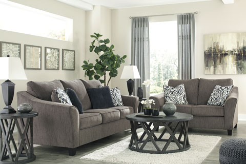 The Ashley Nemoli Sofa and Loveseat Set, model number 45806-38-35, features a stationary design upholstered in slate-colored fabric. The loveseat measures 68 inches in width, 40 inches in depth, and 41 inches in height, while the sofa measures 92 inches in width, 40 inches in depth, and 41 inches in height. Both pieces are part of the Nemoli collection by Ashley. Please note that this item has been discontinued by the manufacturer and is no longer available for purchase.Brand