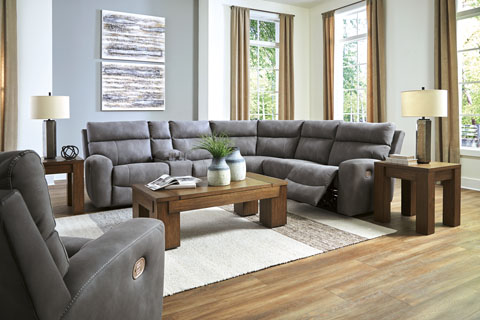The Ashley Next-Gen DuraPella 7-Piece Living Room Set offers a stylish, adaptable, and durable solution for your living space. This power seating package features a modular design, allowing you to rearrange and refresh your room as desired. Upholstered in beautiful and functional faux leather, spills can be cleaned up with ease. For relaxation, the set includes seamless one-touch reclining and adjustable headrests to prioritize your comfort.Brand
