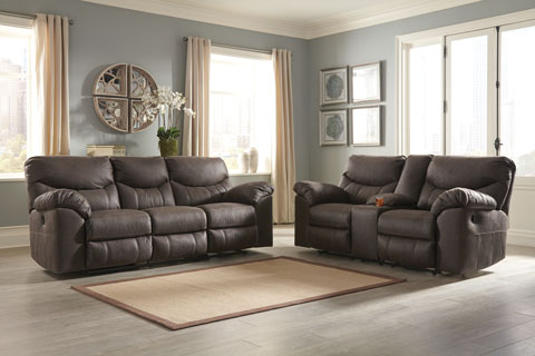 The Boxberg 2-Piece Reclining Living Room Set by Ashley Furniture offers plush comfort and contemporary style. This set includes a reclining sofa and a double reclining loveseat with a console, both featuring soft, faux leather upholstery in a teak color. The sofa measures 93 inches in width, 41 inches in depth, and 41 inches in height, while the loveseat measures 81 inches in width, 41 inches in depth, and 41 inches in height.Brand