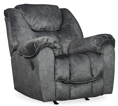 The Capehorn Manual Rocker Recliner by Ashley Furniture is designed to offer luxurious comfort. This generously scaled recliner is wrapped in plush and practical granite gray upholstery. It features scooped pillow-wrapped armrests and curvaceously cushioned head and neck support, providing feel-good flair.Brand