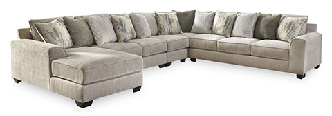 The Ardsley 5-Piece Sectional by Ashley Furniture offers plush comfort and contemporary style. This sectional includes a left-arm facing corner chaise, armless loveseat, armless chair, wedge, and right-arm facing sofa, all upholstered in soft pewter-colored polyester chenille fabric. The reversible seat and back cushions are filled with high-resiliency foam wrapped in thick poly fiber, ensuring lasting comfort. The set is complemented by 12 accent pillows that add texture and visual interest. Exposed feet with a faux wood finish provide a subtle contrast to the upholstery. The sectional's modular design allows for versatile configurations to fit various living spaces.Brand