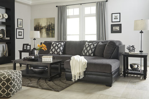 This 2-piece sectional features a left-arm facing sofa and a right-arm facing corner chaise, both upholstered in a smoke-colored fabric. The sofa measures 76 inches in width, 39 inches in depth, and 40 inches in height, while the chaise is 47 inches wide, 74 inches deep, and 40 inches high.Brand