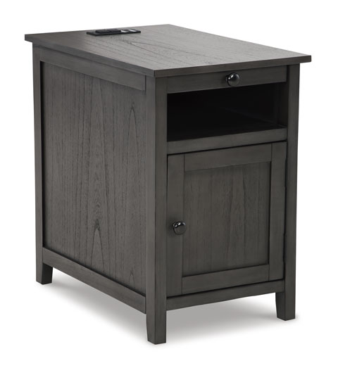 The Treytown Chairside End Table is crafted from solid wood, wood veneer, and MDF substrate, featuring a gray wood tone finish. This functional piece includes a storage cabinet, an open cubby shelf, and a pull-out tray. Additionally, it offers a 110V power supply with dual USB charging ports, making it both stylish and practical for modern living spaces.Brand
