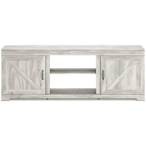 The Bellaby 63" TV Stand features a wispy white finish over replicated oak wood grain, offering a fresh take on farmhouse style. Its clean-lined design, inspired by barn doors, adds a country chic aesthetic to your living space. The stand includes two storage cabinets, each equipped with an adjustable shelf, and a removable center shelf, providing ample storage options. Cutouts for wire management and ventilation ensure a clutter-free setup. Additionally, this stand is compatible with the W100-101 and W100-02 fireplace inserts (sold separately), allowing you to add warmth and ambiance to your room.Brand