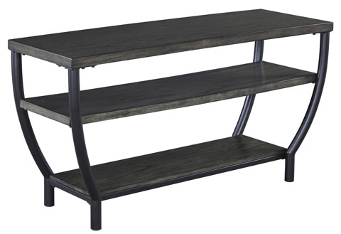 The Champori TV Stand by Ashley Furniture showcases a contemporary design with a grayish brown finish and gunmetal-colored tubular steel construction. Measuring 48.5 inches in width, 17 inches in depth, and 24.88 inches in height, it features three fixed open shelves, providing ample space for organizing electronics and media.Brand