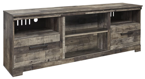 The Derekson XL TV Stand with Fireplace Option by Ashley Furniture features a rustic butcher block finish over replicated pine grain, complemented by contemporary antiqued gunmetal-finished handles. It includes two storage cubbies and two smooth-operating drawers with side roller glides for easy access. The stand is compatible with the W100-101 electric fireplace insert, allowing for added warmth and ambiance.Brand
